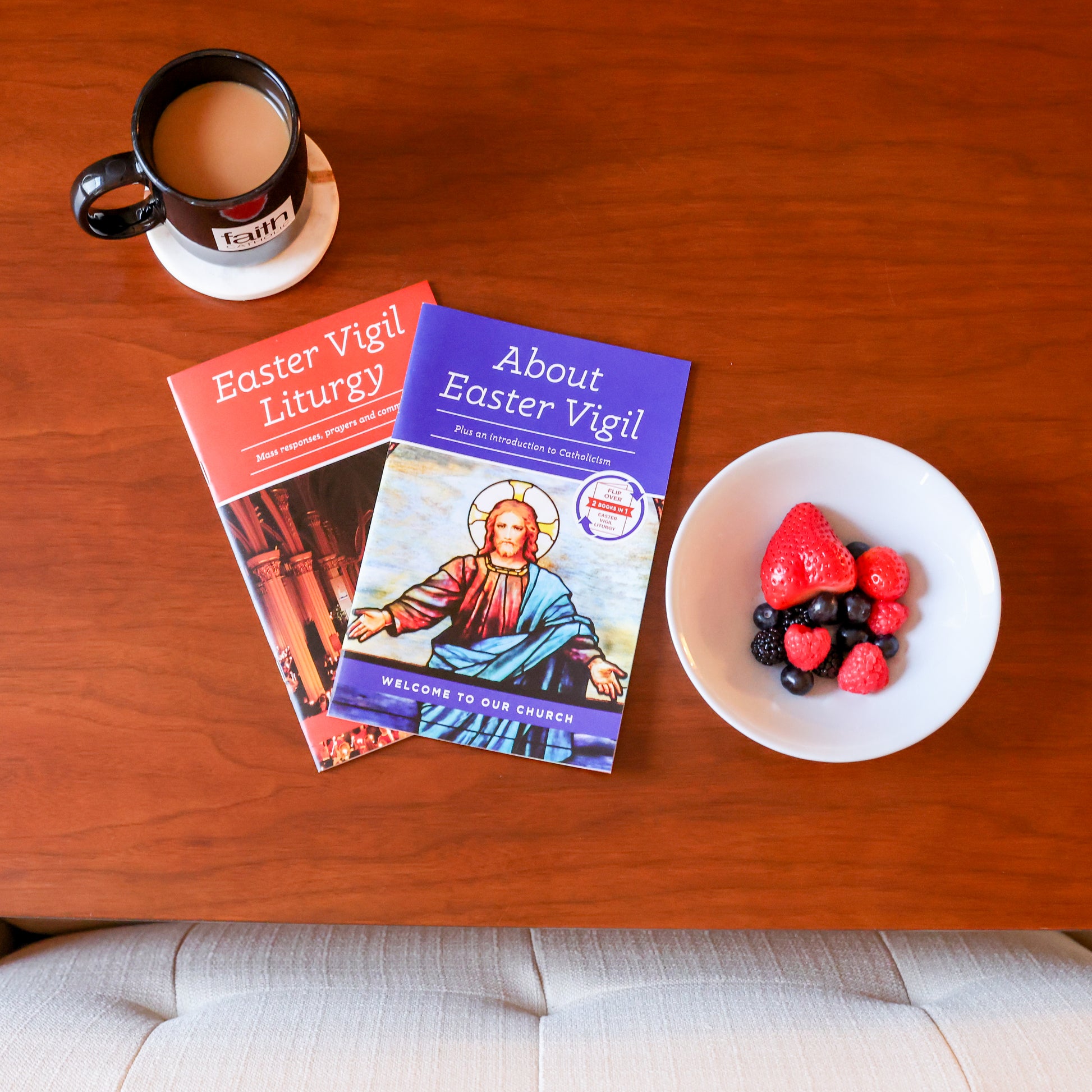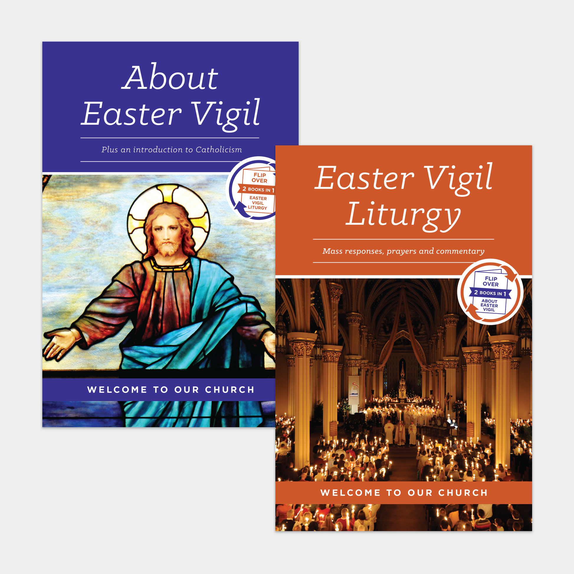 Part of our 2 Books in 1 series, this informative four-color booklet focuses on the beautiful and solemn Easter Vigil Mass. About Easter Vigil includes a completely updated explanation of the new Order of Christian Initiation of Adults (OCIA), as well as the history and symbolism of the Vigil. Also included is a section on “What Catholics Believe,” outlining the basic tenets of the Catholic faith. Flip over for Easter Vigil Liturgy. This useful booklet offers a complete worship aid with commentary for full participation in this most important liturgy of the year.