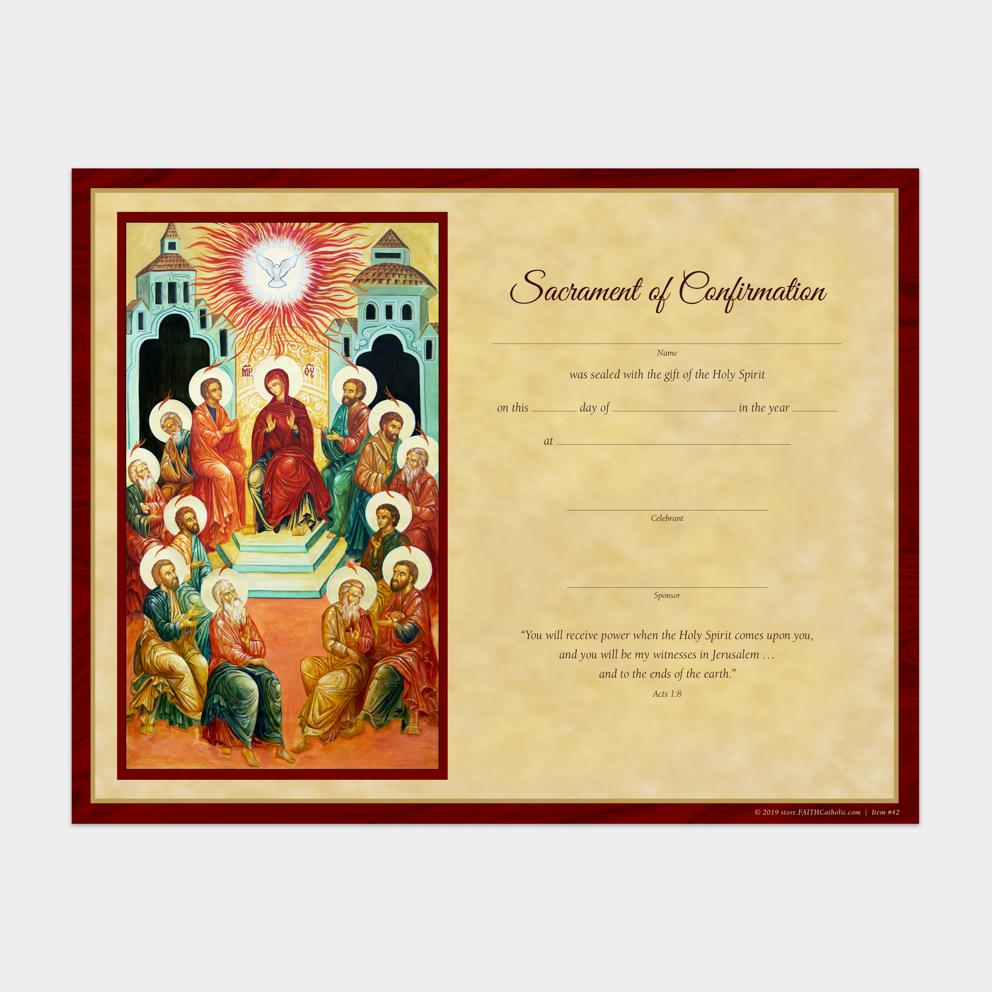 Recognize the sacraments of initiation for those receiving the Sacrament of Confirmation with this beautiful, full-color certificate with original artwork that is suitable as a framed keepsake. (8.5 x 11, 80# uncoated text) Sold in packs of 25.