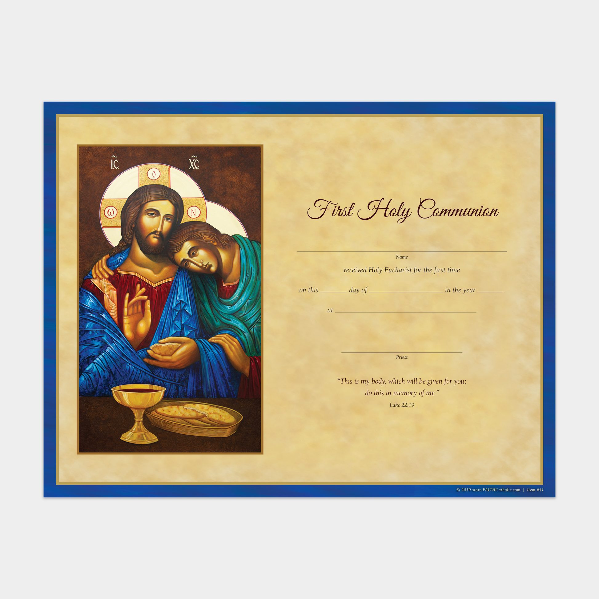 Recognize the sacraments of initiation for those receiving their First Holy Communion with this beautiful, full-color certificate with original artwork that is suitable as a framed keepsake. (8.5 x 11, 80# uncoated text) Sold in packs of 25.